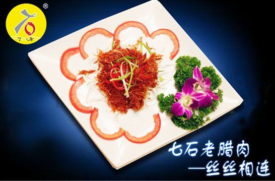 七石老腊肉系列包括依依不舍、念念不忘、丝丝相连、窃窃私语、片片情深5款菜品。七石老腊肉系列菜品采用原始的腊肉烹制技术,通过秘制的腌熏后,加工成各种口味的七石老腊肉系列美食,七石老腊肉采用优质上乘的猪肉做为原材料,无任何添加与污染,是正真的绿色环保菜肴。